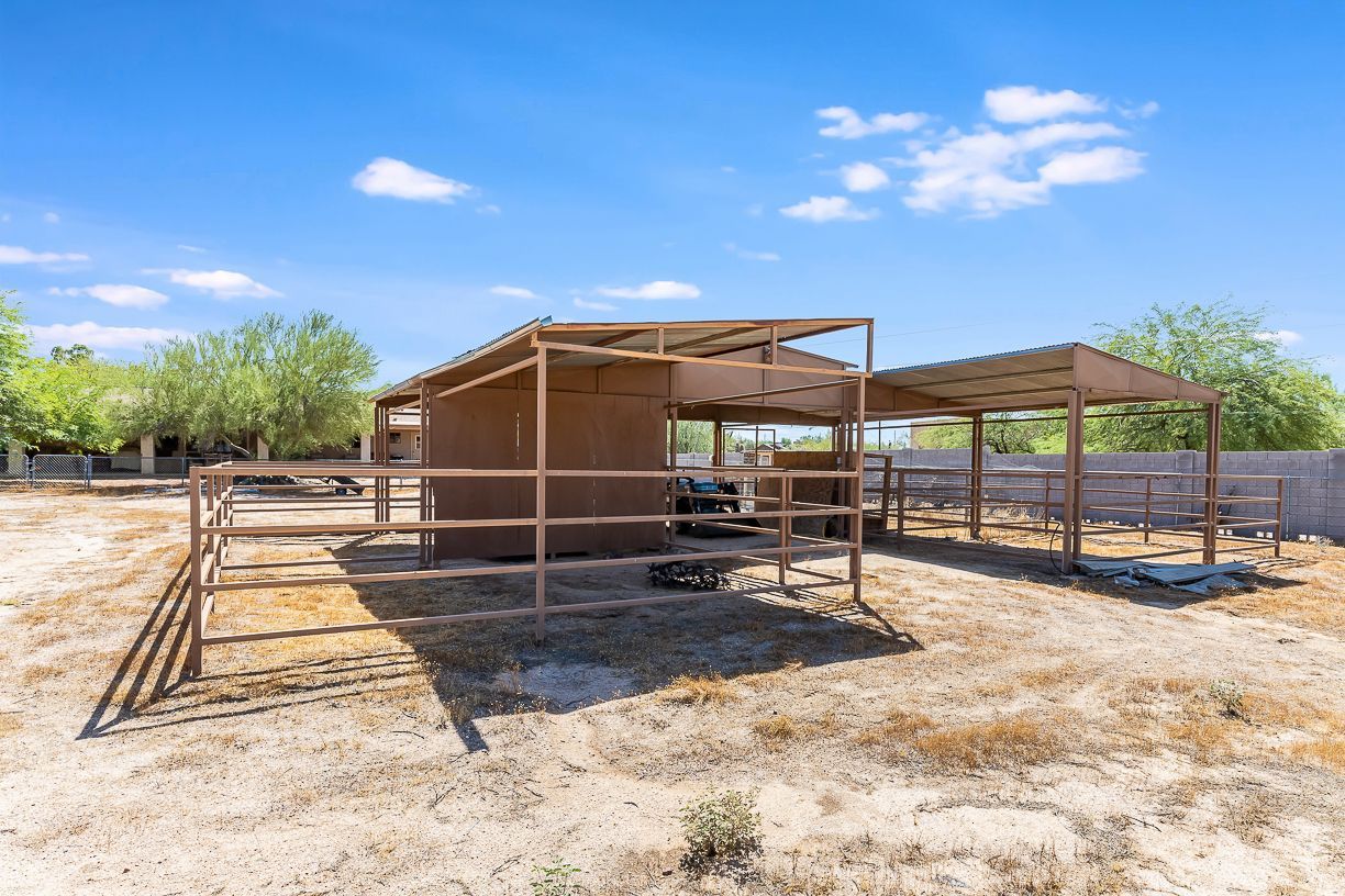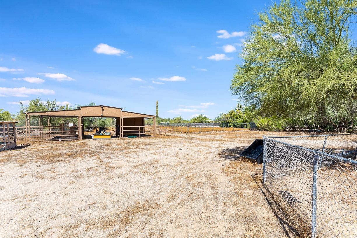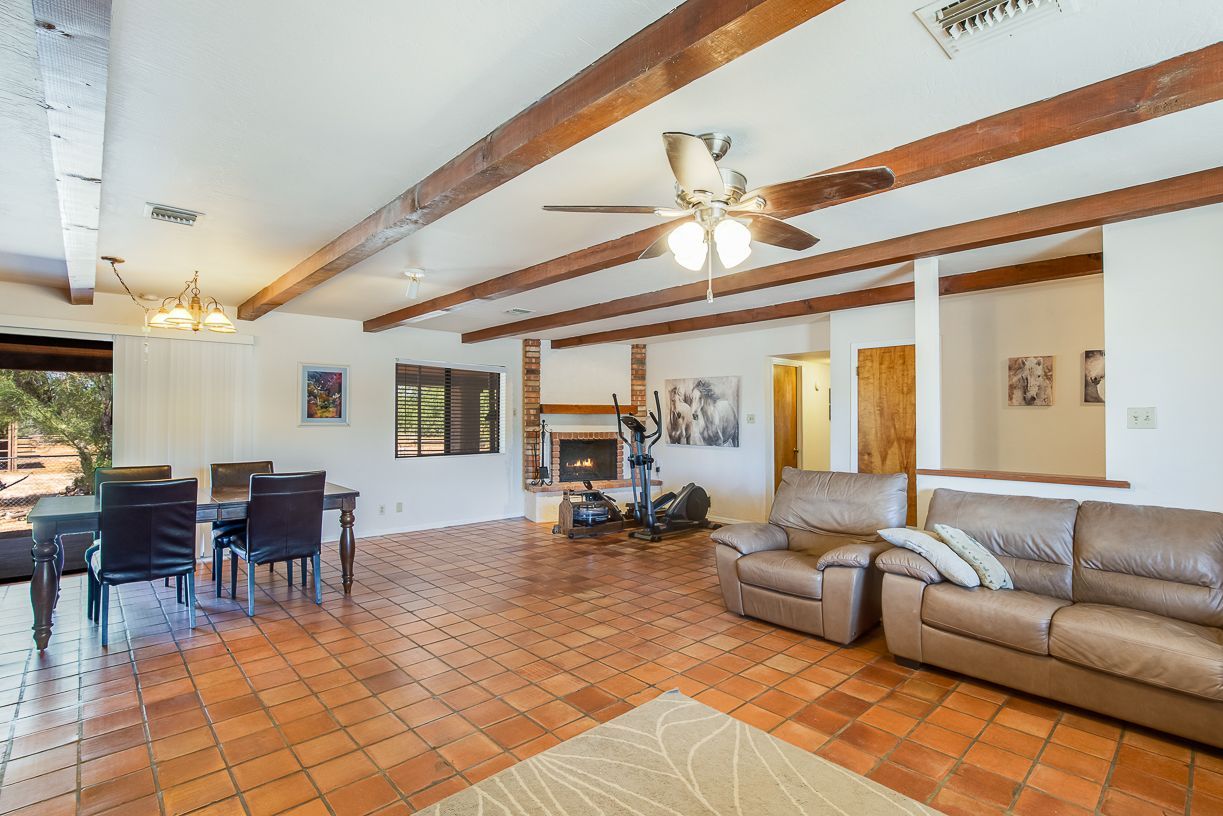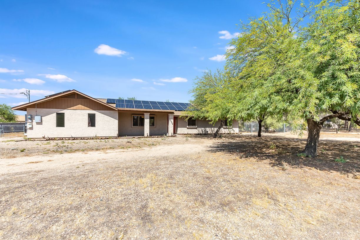 Excellent investment opportunity! This exceptional horse property sits on a 1.1-acre lot with PAVED ROAD access, offering spacious living and abundant privacy. The open great room features beautiful Saltillo tile, wood-beamed ceilings, and a charming wood-burning fireplace. The eat-in kitchen boasts a convenient breakfast bar, ample counter space, and a stainless steel fridge. The master suite includes a large closet and an en-suite bathroom with a walk-in shower. Benefit from extremely low energy bills with leased solar panels! The property also has a BRAND NEW roof with a 50-year warranty. The 2-car garage comes equipped with a full workbench. Outdoors, you'll find a huge extended covered patio, fenced yard, 4-stall barn, enclosed chicken coop, working shed with power and water supply, and MUCH more! Don’t miss this excellent investment opportunity to own a property with such incredible amenities and potential!